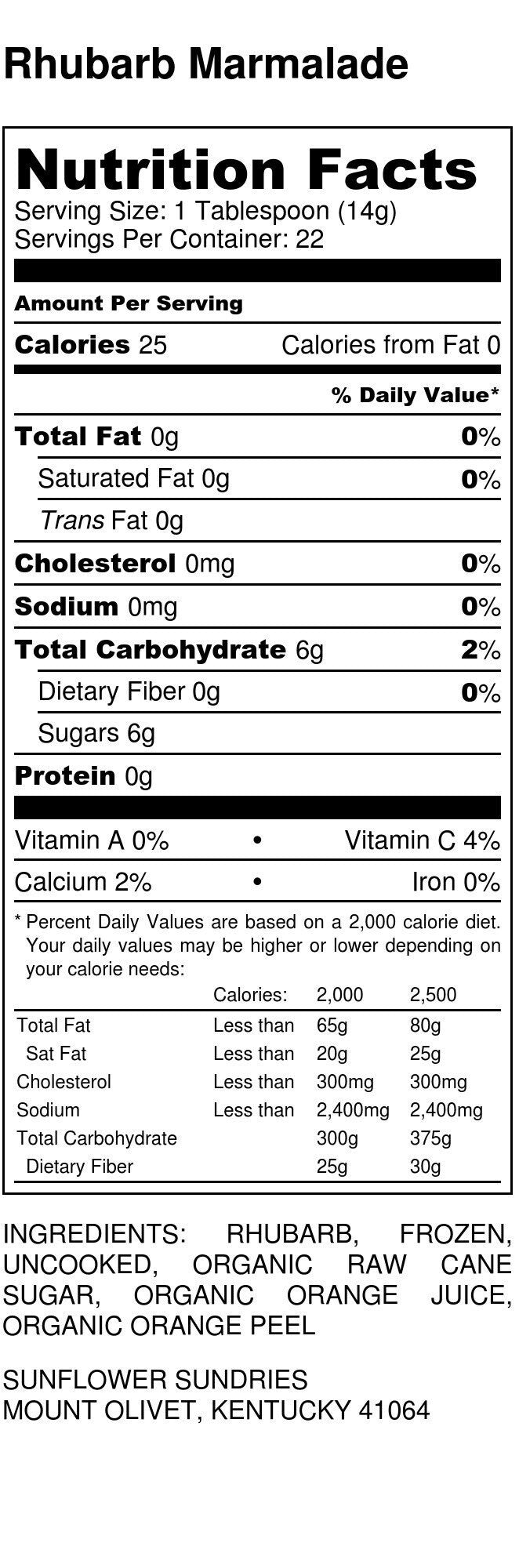 Made with Rhubarb, Organic Orange Peel, Organic Cane Sugar, and Organic Orange Juice.